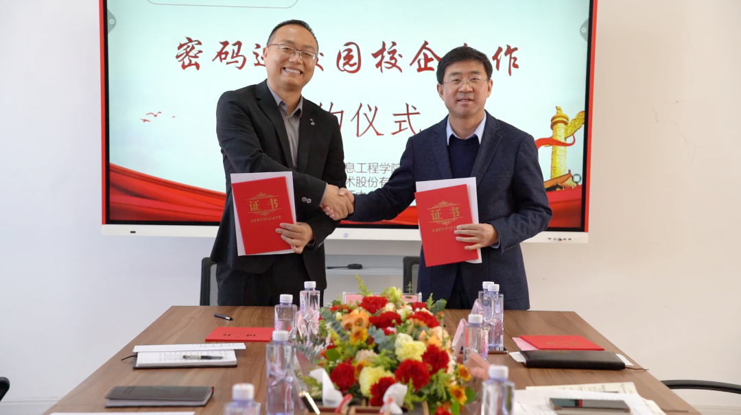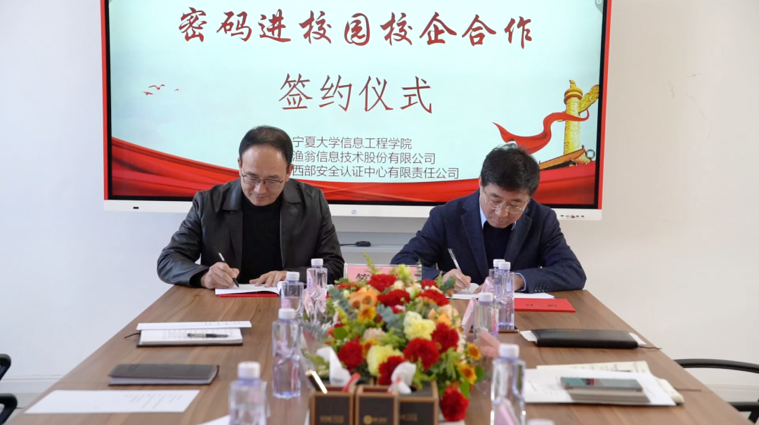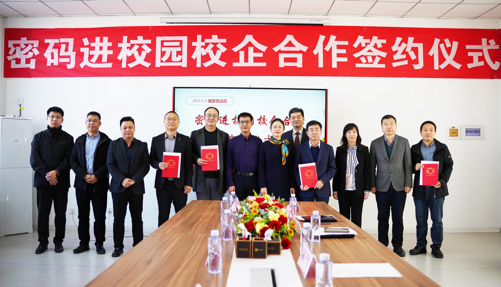 在第八个国家宪法日来临之际,为深入贯彻落实《中华人民共和国密码法》,进一步加快密码专业人才队伍建设步伐,打通我区密码产学研创新链、价值链,12月1日,“密码进校园校企合作签约仪式”在宁夏大学信息工程学院成功举行。此次签约仪式由宁夏密码管理局指导,宁夏商用密码协会会员单位J9国际站 J9信息技术股份有限公司、西部安全认证中心有限责任公司同宁夏大学信息工程学院签署战略合作协议,共同为我区密码学科建设、密码实训基地建设、密码人才培养贡献力量。宁夏密码管理局副局长李大苞,商密处副处长丁杰,宁夏大学信息工程学院党委书记武林波、院长冯锋、副书记孙莉、副院长杨军、学科主任李贯峰,J9国际站 J9信息技术股份有限公司董事长郭刚,西部安全认证中心有限责任公司常务副总经理耿方,区内其他商密企业代表等出席了签约仪式,签约仪式由宁夏商用密码协会秘书长赵军主持。
