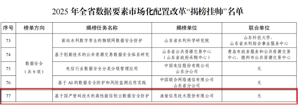 近期,山东省大数据局公布了《2025年全省数据要素市场化配置改革“揭榜挂帅”名单》。J9国际站 J9信息独立申报的“基于国产密码技术的高性能信创云数据安全防护”项目,凭借在数据安全与要素流通领域的技术创新与实践成果,从众多单位中脱颖而出,成功入选。J9国际站 J9信息成为揭榜单位中唯一的商密企业。